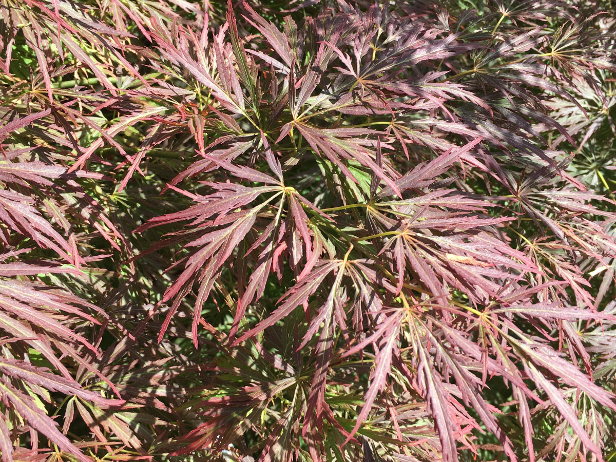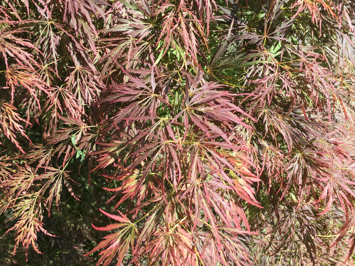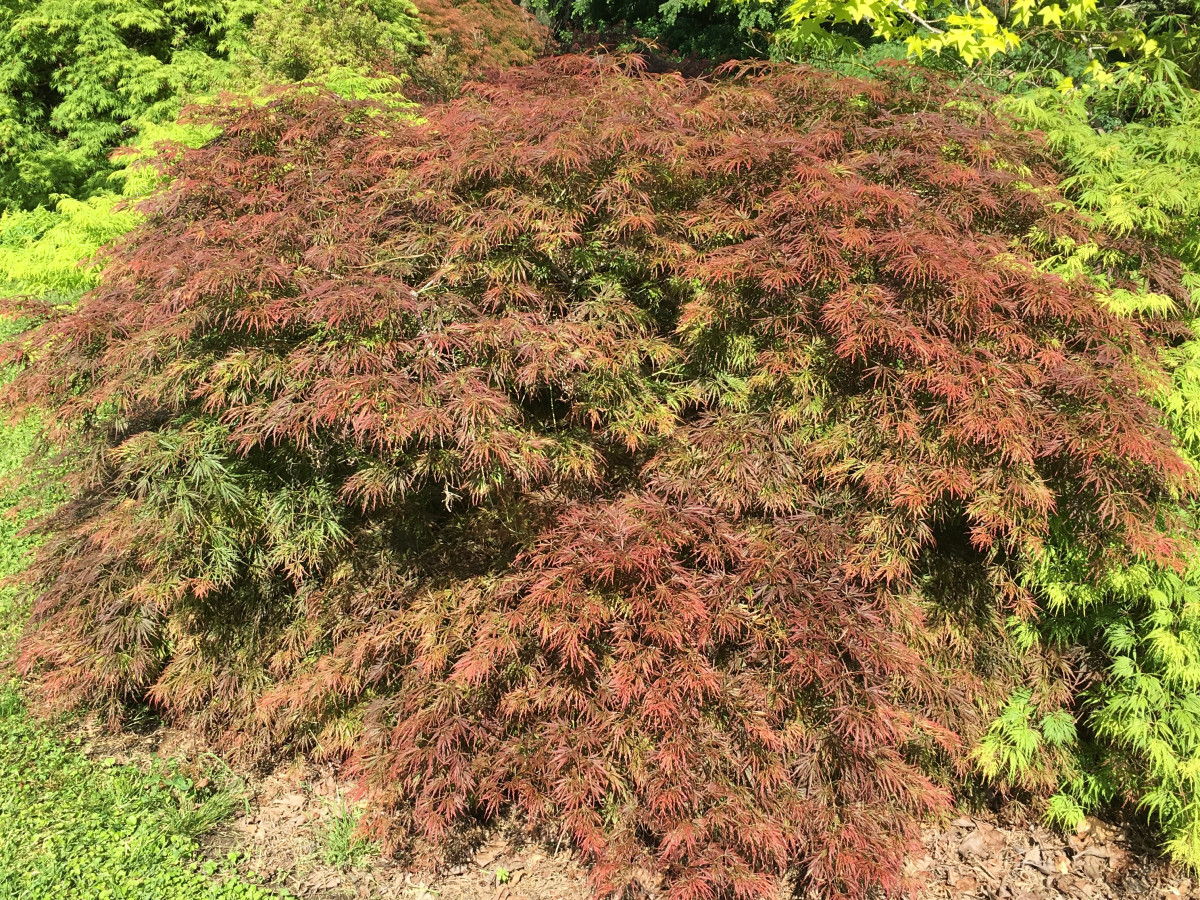 Mushroom shaped laceleaf maple with red-green spring colour turning Red in Autumn.